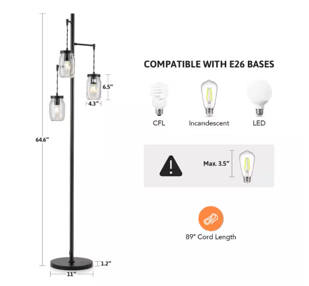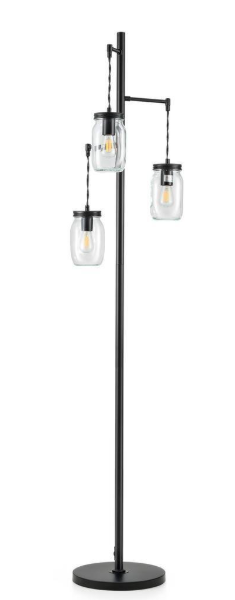 Merra 64 in. Black Farmhouse Tree Floor Lamp with 3 Mason Jar Glass Shades PTL-0621-BK-BNHD-1