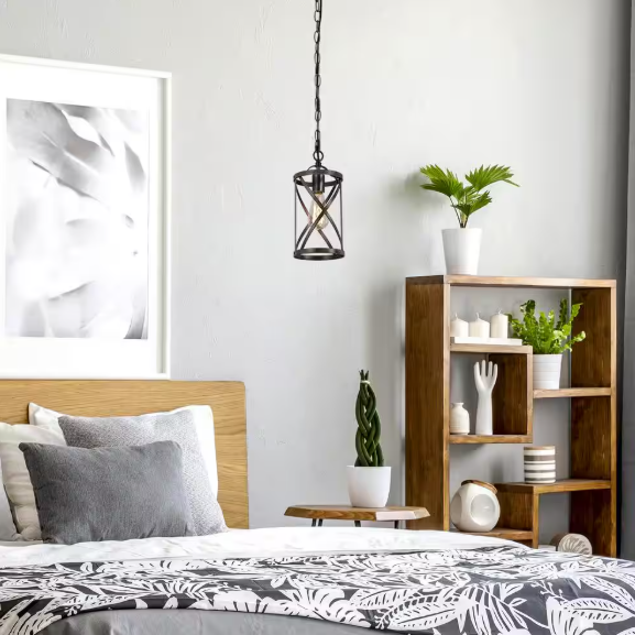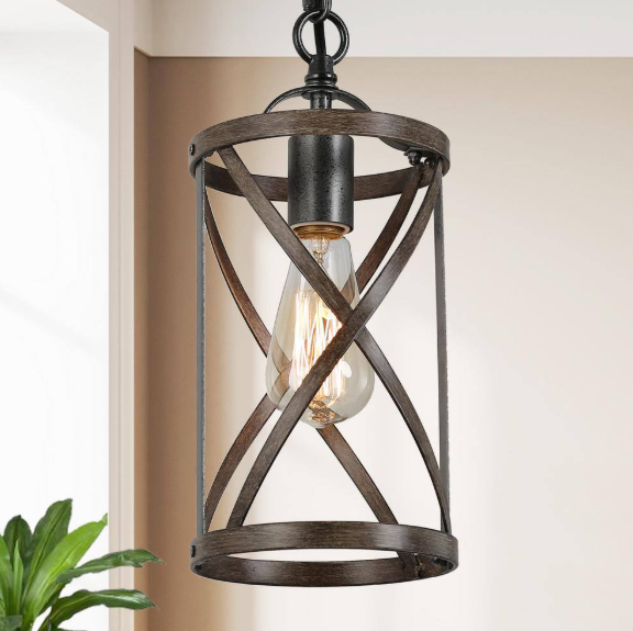 Uolfin Modern Cage Chandelier Pendant Light Firefly 1-Light Farmhouse Bronze Drum Pendant Light with Wood Accent 628Z7VFAINU4145